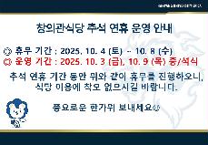 | 381 | [창의인재원(전체기숙사)]창의관식당 추석 연휴 운영 안내 | 관리자 | 2025.09.23 | |