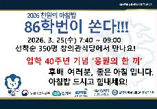| 430 | [장학복지회]창의관식당 천원의 아침밥 ‘86학번이 쏜다!!’ 이벤트 안내 | 관리자 | 2026.03.25 | |
