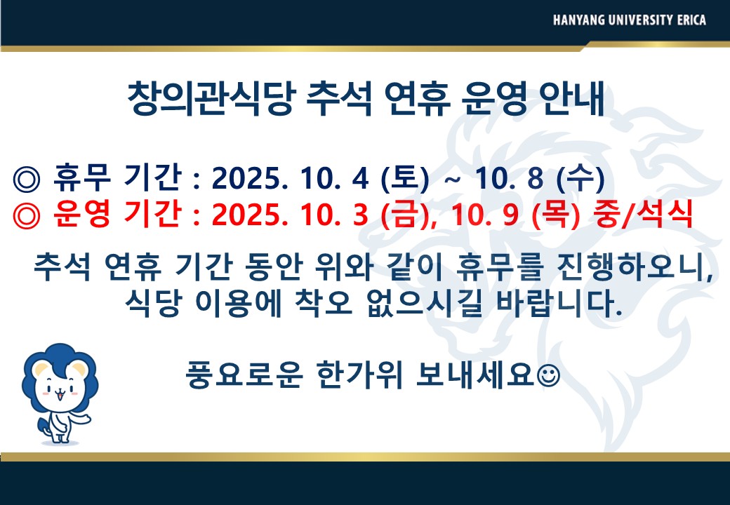 [창의인재원(전체기숙사)]창의관식당 추석 연휴 운영 안내