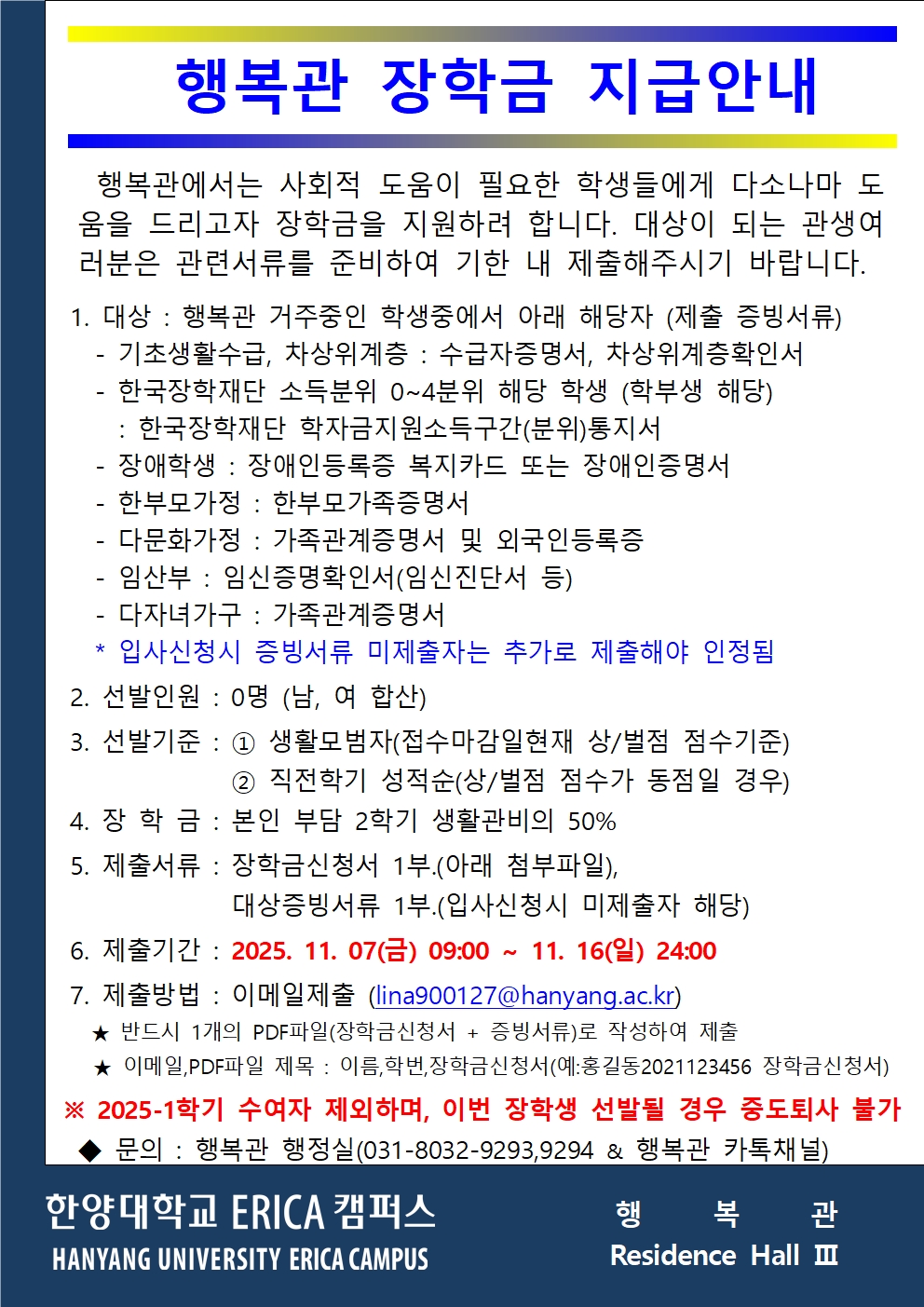 [행복관]2025학년 2학기 행복관 장학금 신청 안내